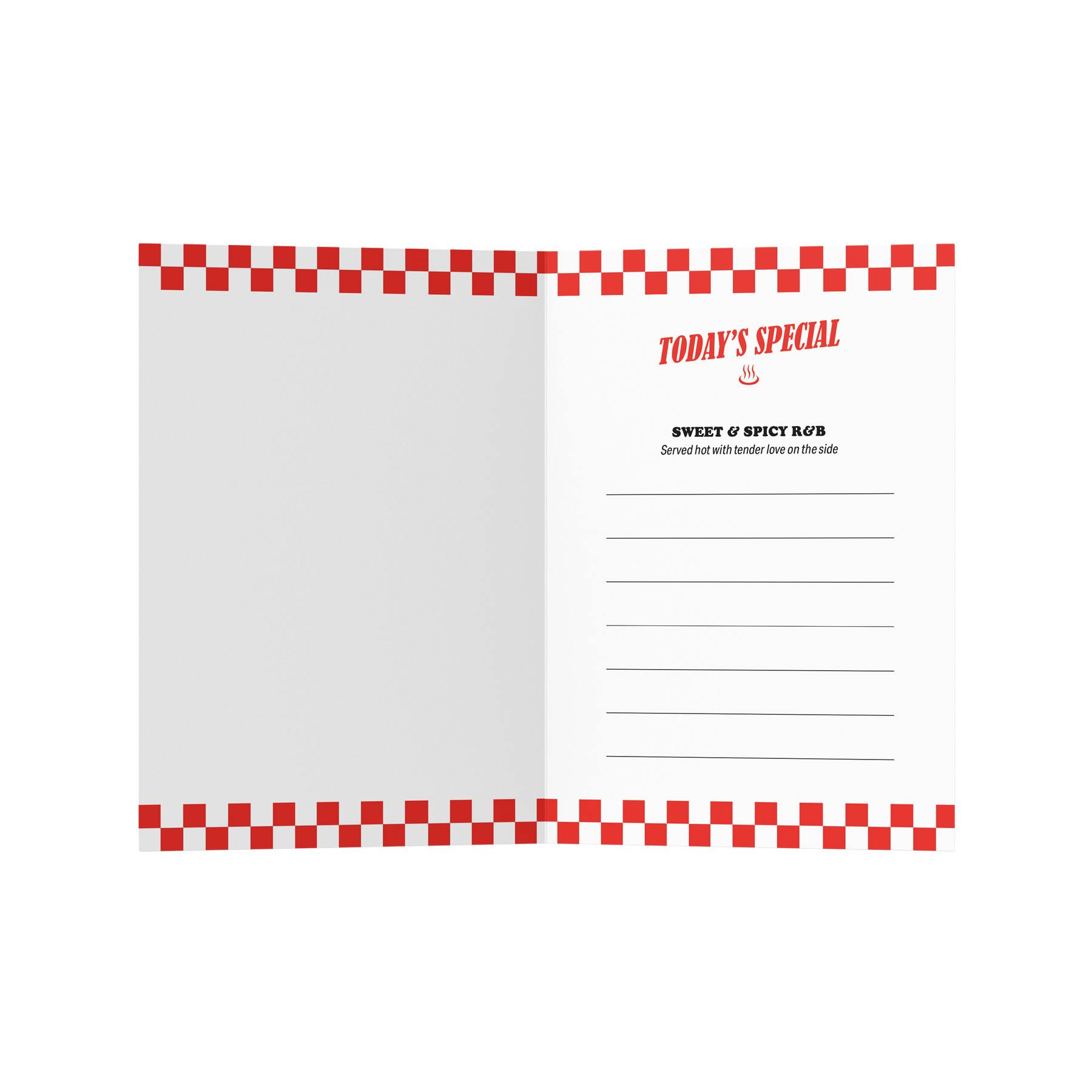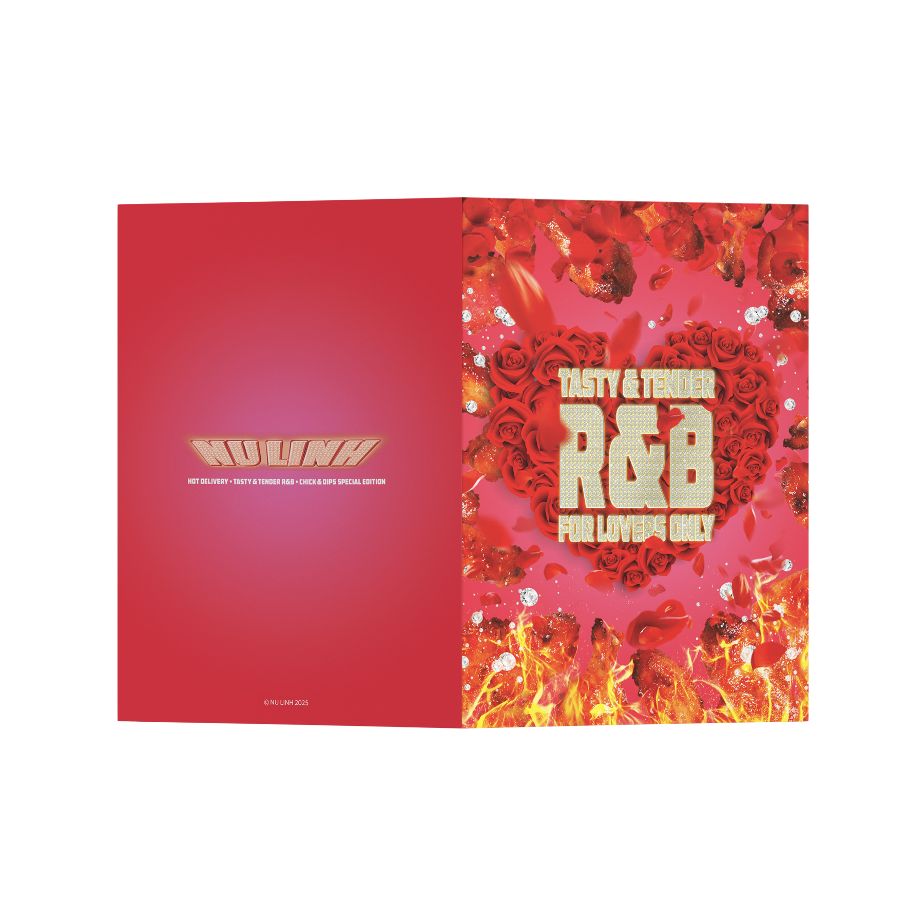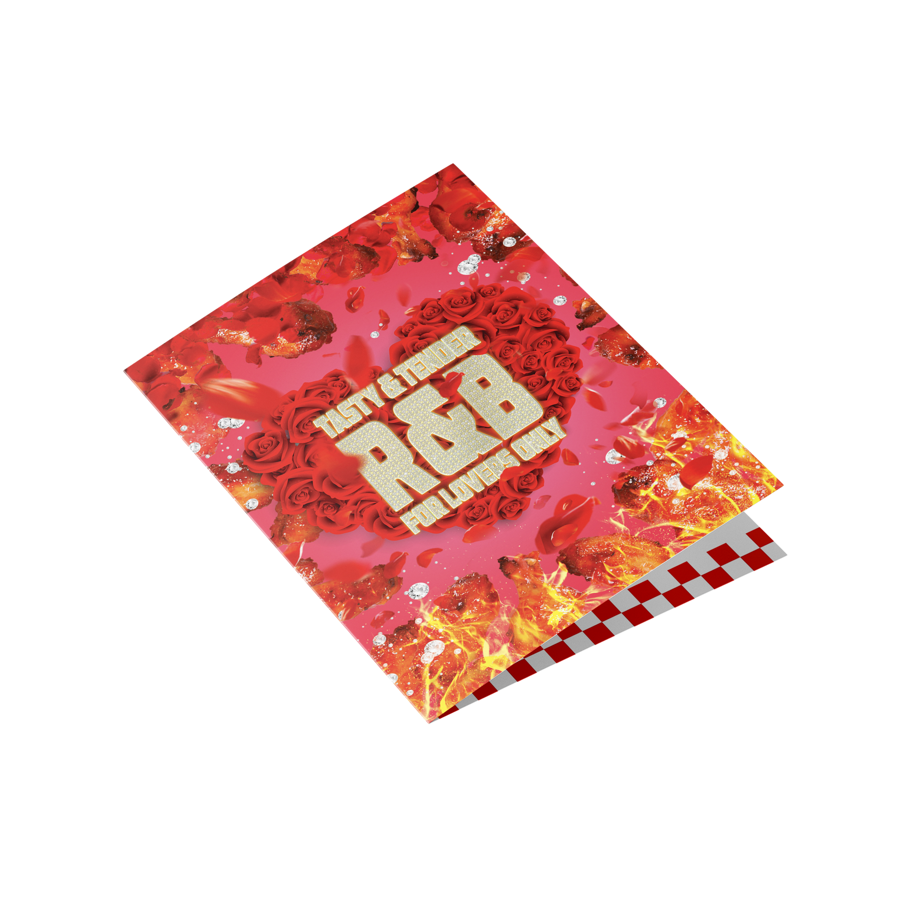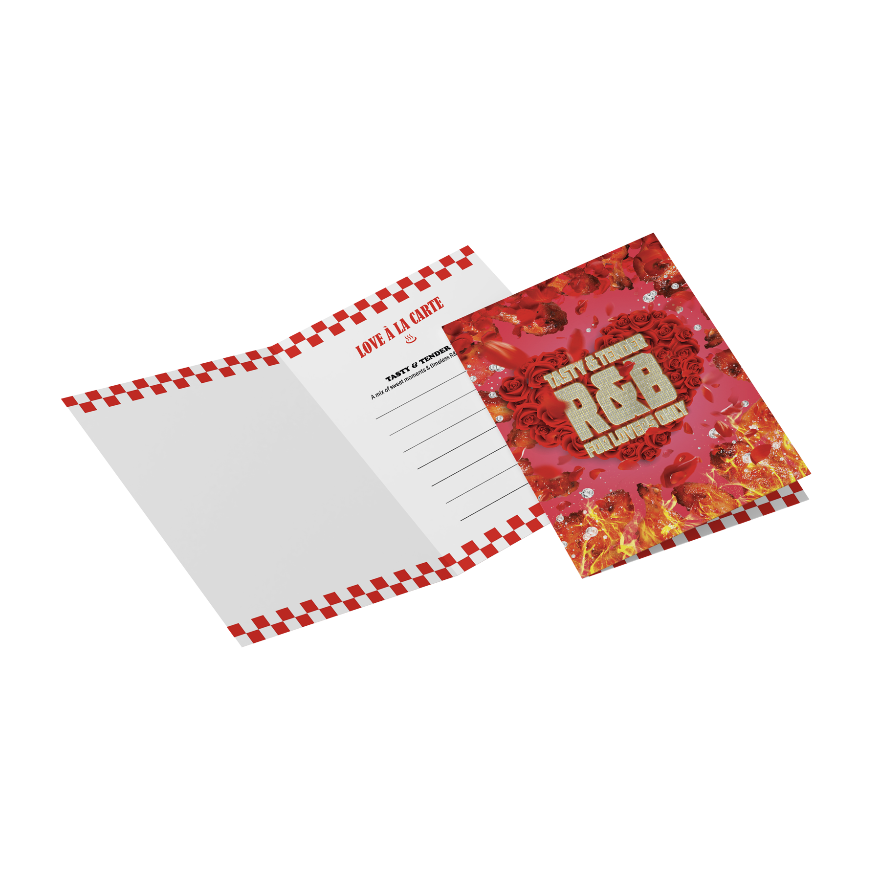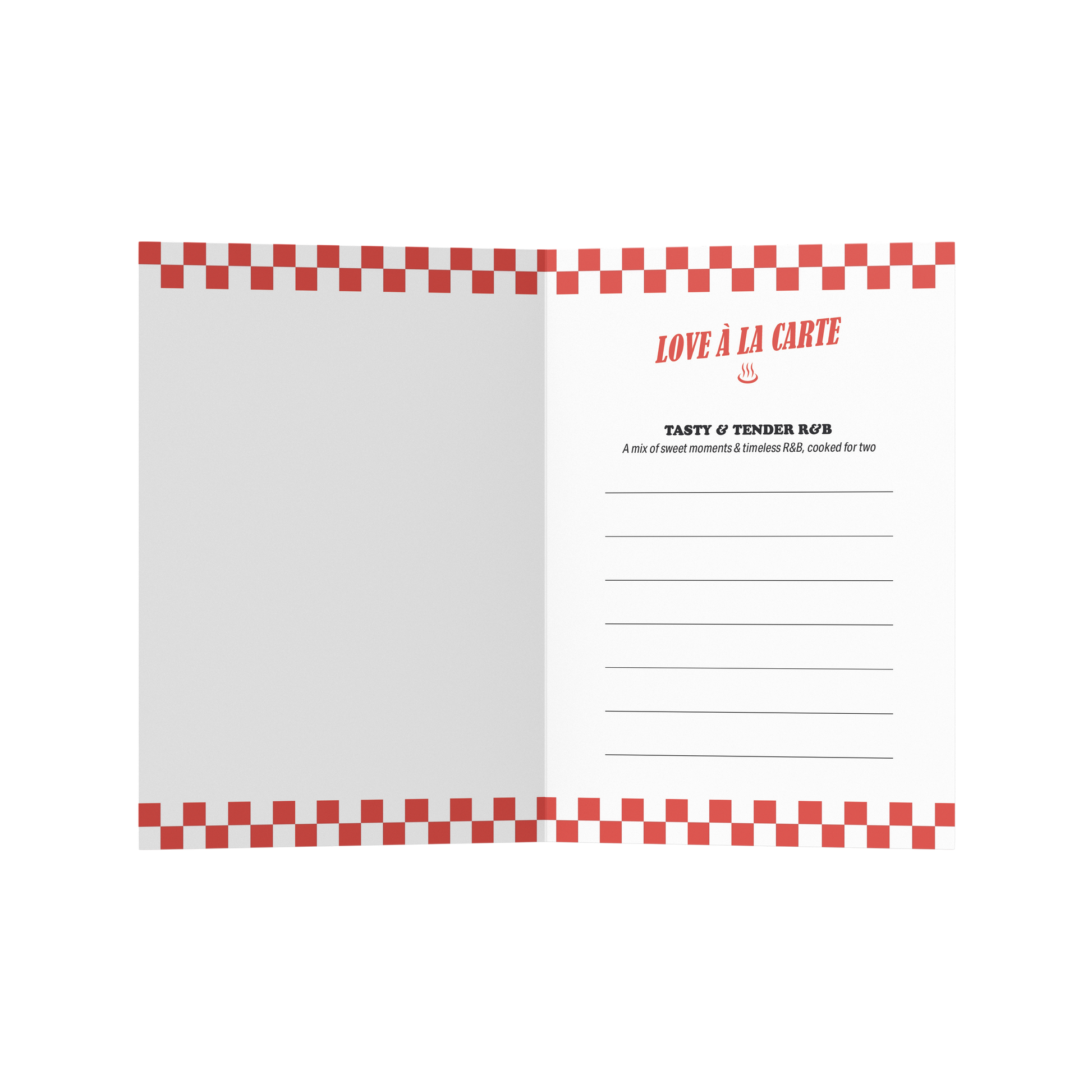 - 💌 Intérieur : “Today’s Special: Sweet & Spicy R&B. Served hot, with tender love on the side.” ou "Love à la carte: A mix of sweet moments & tasty R&B, cooked for two."